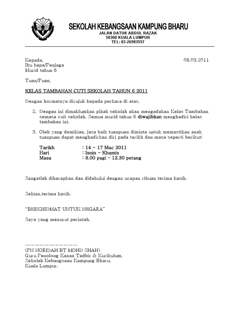 Contoh Surat Makluman Kelas Tambahan Kepada Ibu Bapa Otosection